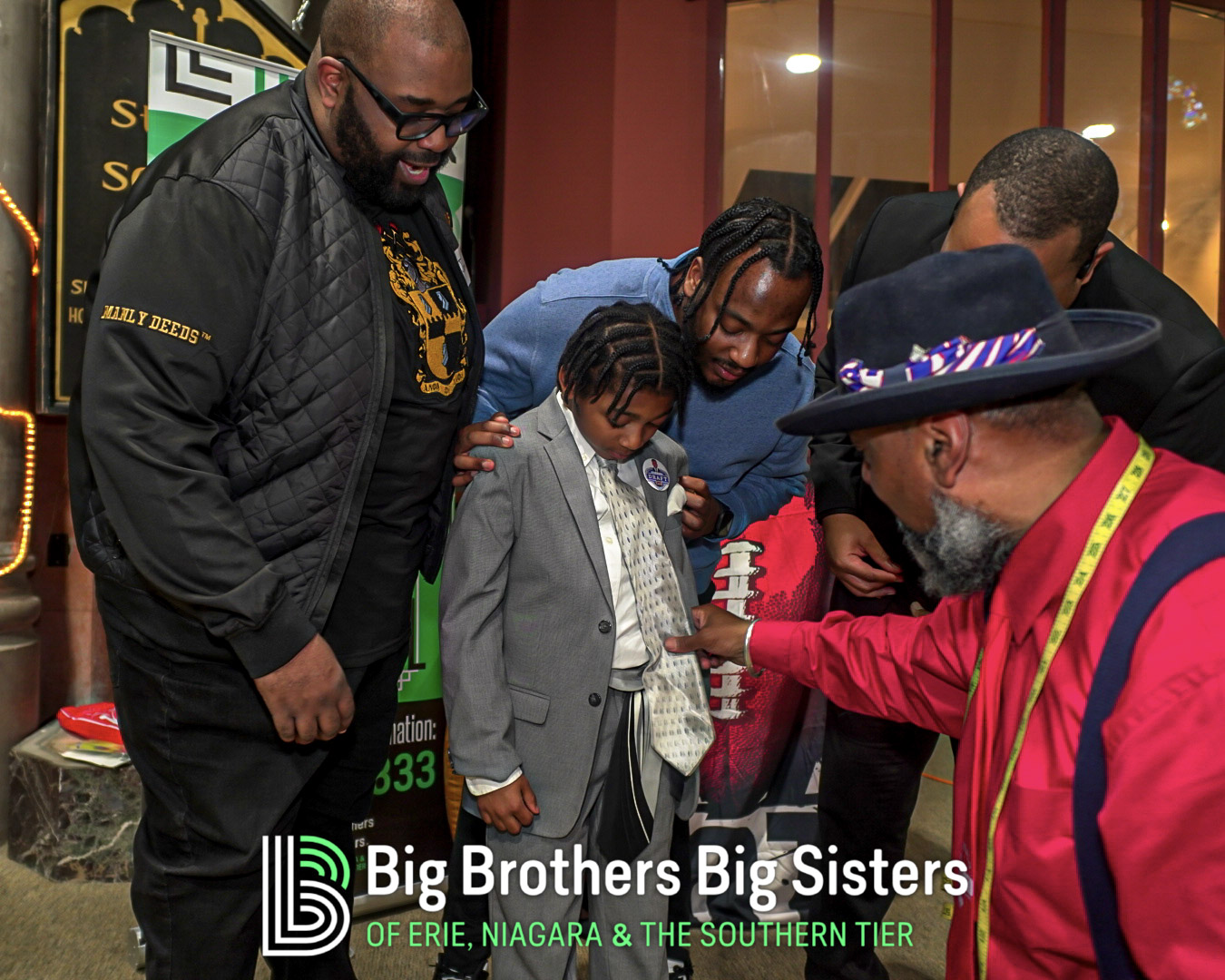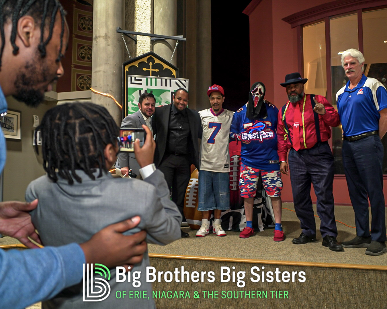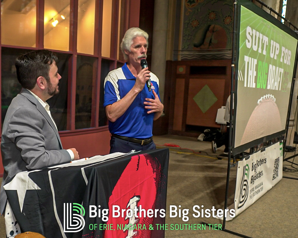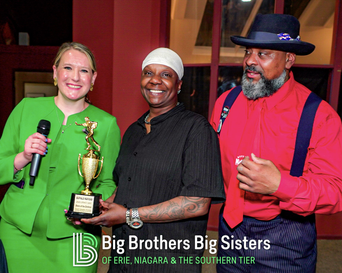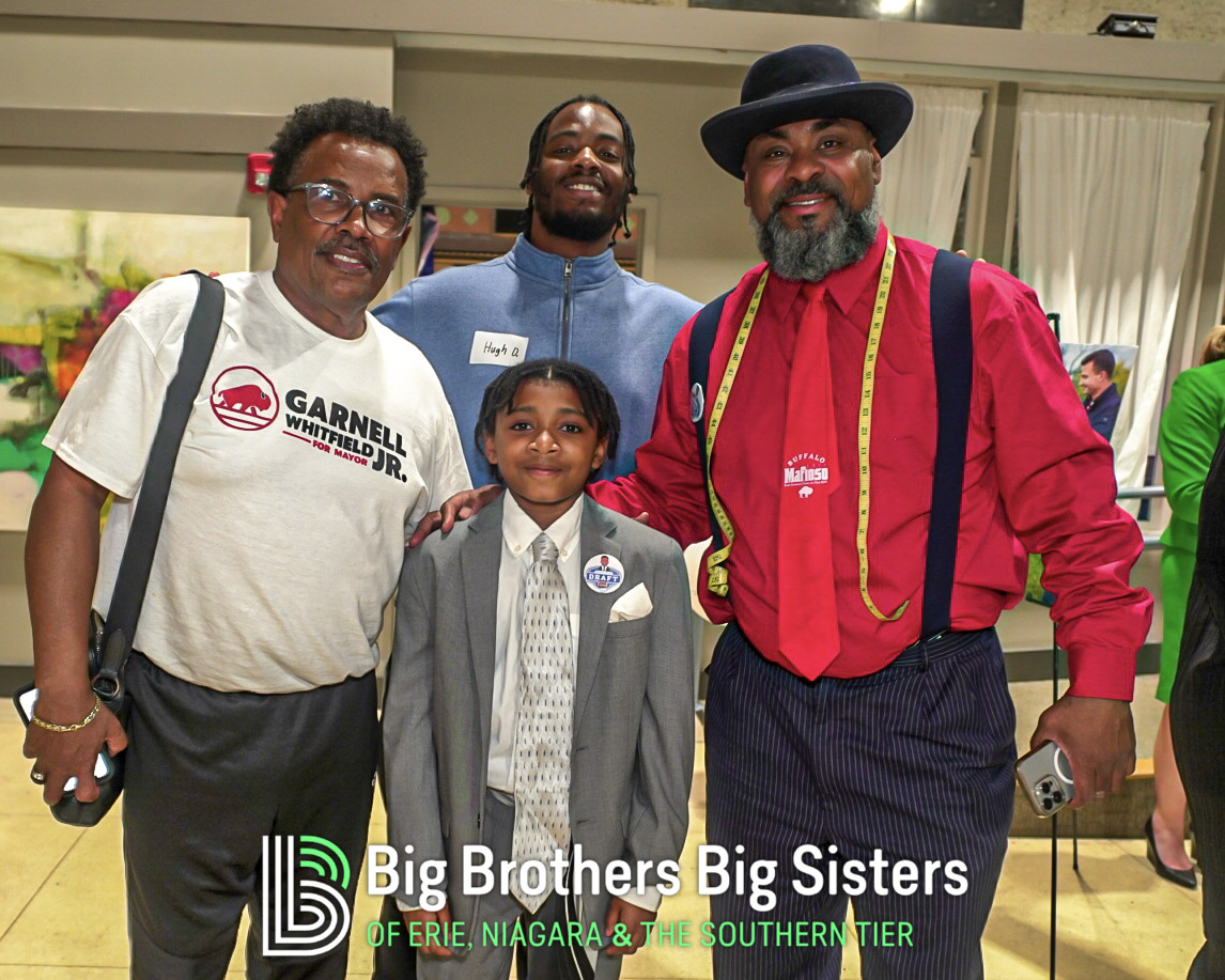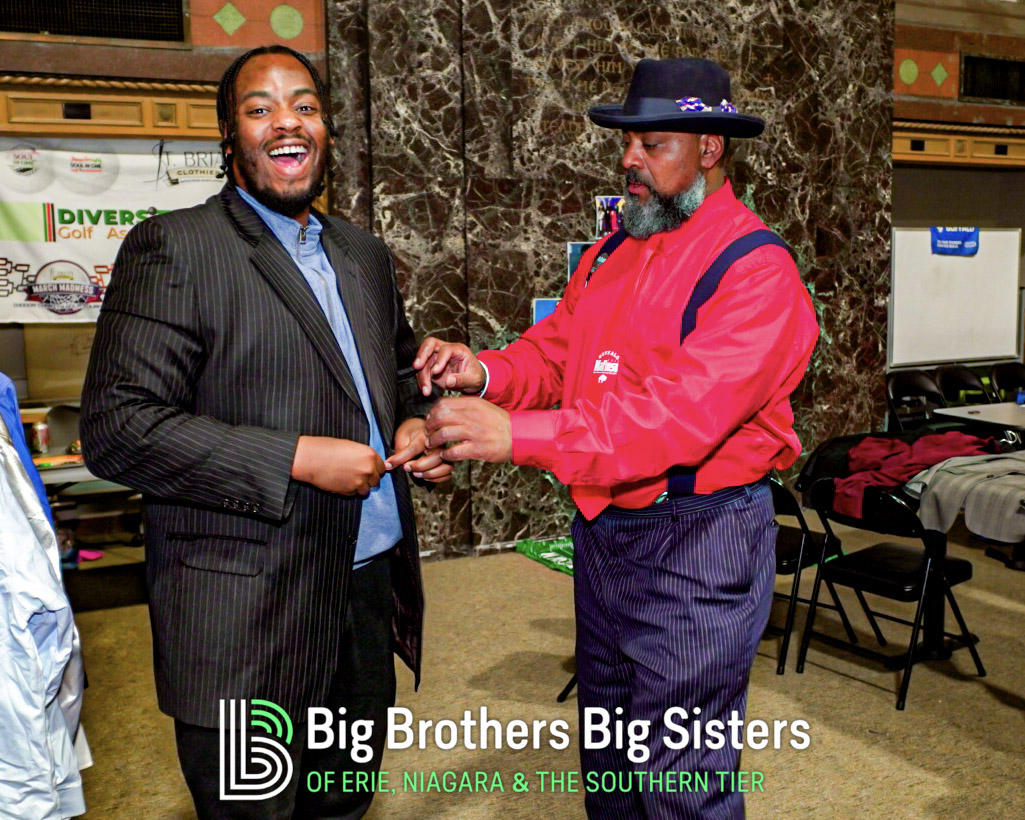 BIG thanks to everyone who made this two-day experience unforgettable: St. Brian Clothiers for styling our Littles, The Buffalo Mafioso and Buffalo Ghostface for bringing out the fan energy, and King Urban Life Center for hosting us in their beautiful, historic space. D Real McCoy (Devon McCune) handled our A/V like a pro, Jonathan Zelasko of The Vintage Raider 716 brought out some awesome vintage Bills gear to give away, and our friends at The Challenger, Legendary Mix 1080 WUFO, Power 96.5, and WUFO’s Muki Hawkins who helped spread the word about the events. We’re grateful for every person and partner who showed up, suited up, and helped bolster our team and change the lives of many Littles waiting for a Big.